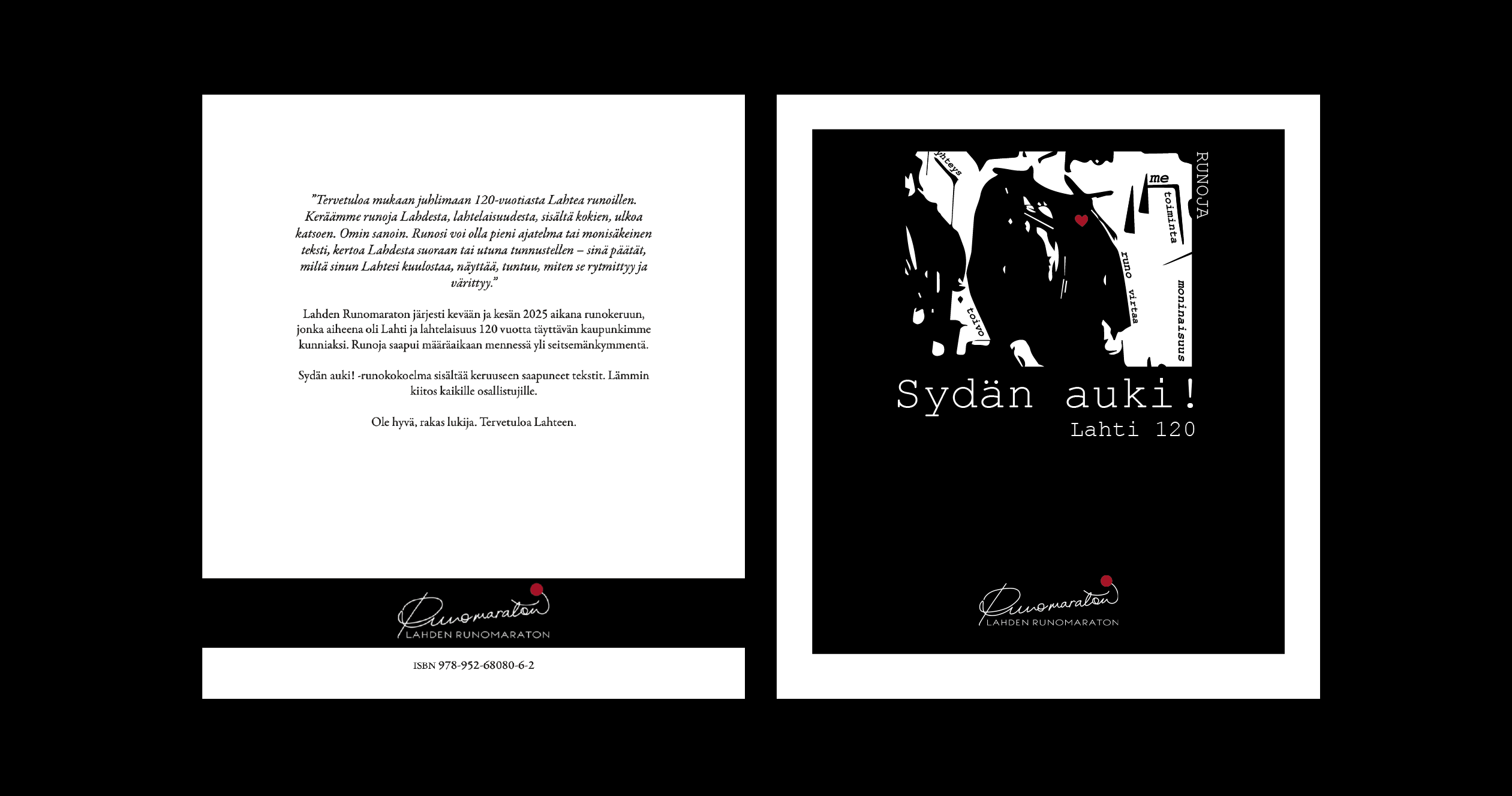 Keväällä 2025 järjestetyn runokeruun runosato yllätti runsaudellaan, moninaisuudellaan ja laadukkuudellaan. Runoja on jaettu Runomaratonin some-alustoilla, Runokatu-näyttelyssä ja esitetty elokuisen Runojuhlan yhteydessä. Yleisön toive on ollut: lisää! Lahden Keskusta-alueen kumppannuuspöytä tuli yhteistyökumppaniksemme ja pystyimme tuottamaan kirjan sähköiseen muotoon. Sydän auki! Lahti 120 -runokokoelma on sähköisesti ladattavissa omalle koneelle tai luettavissa suoraan verkossa. Kirja on pdf-muodossa, joten on mahdollista tulostaa kirja tai sivuja siitä omaan käyttöön.